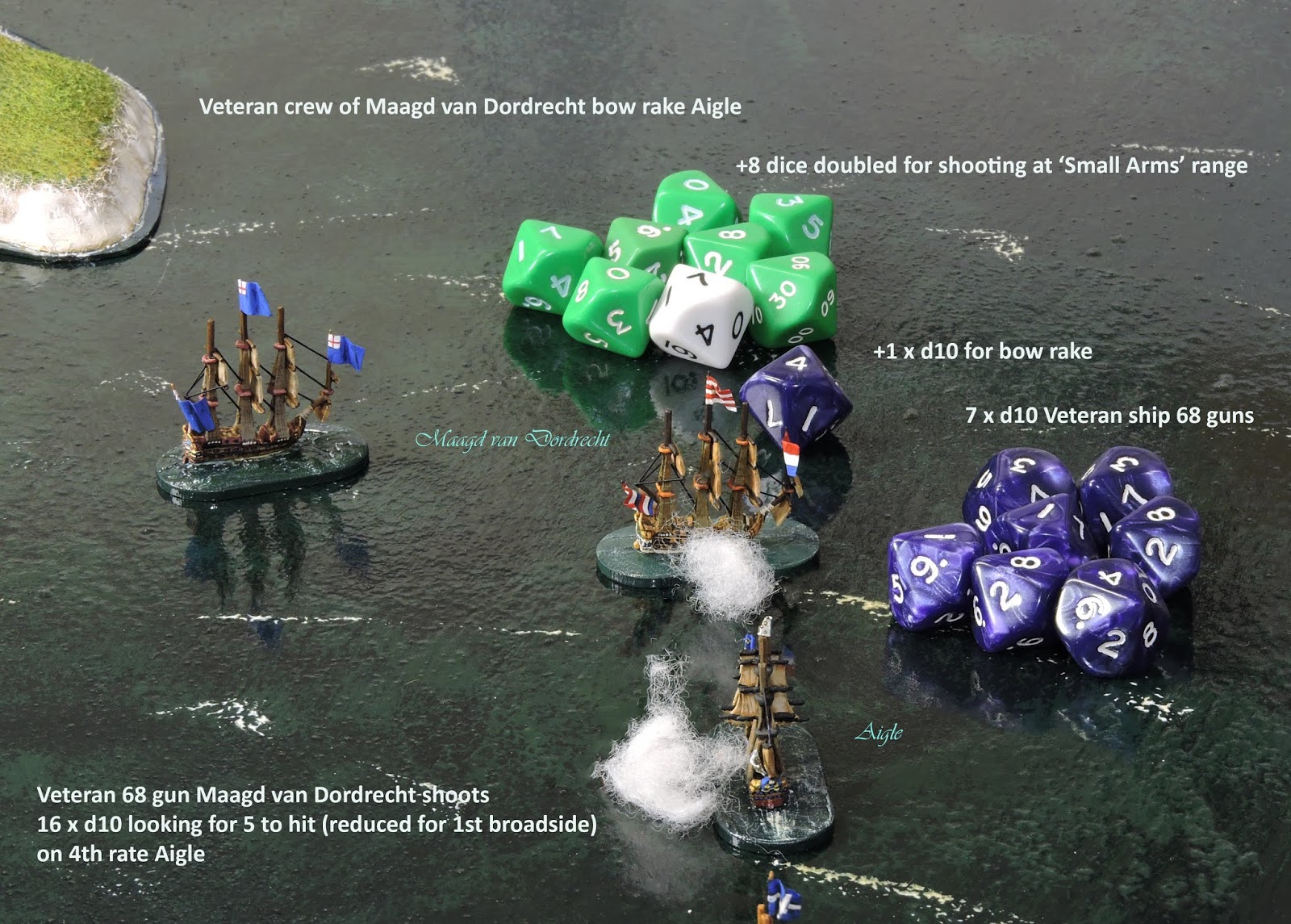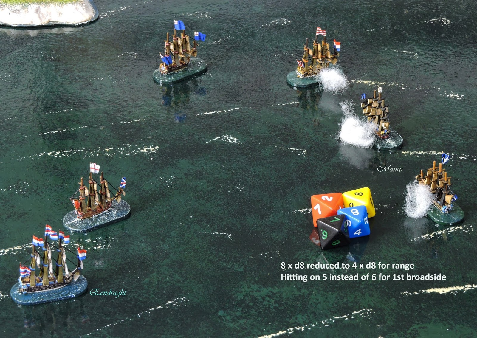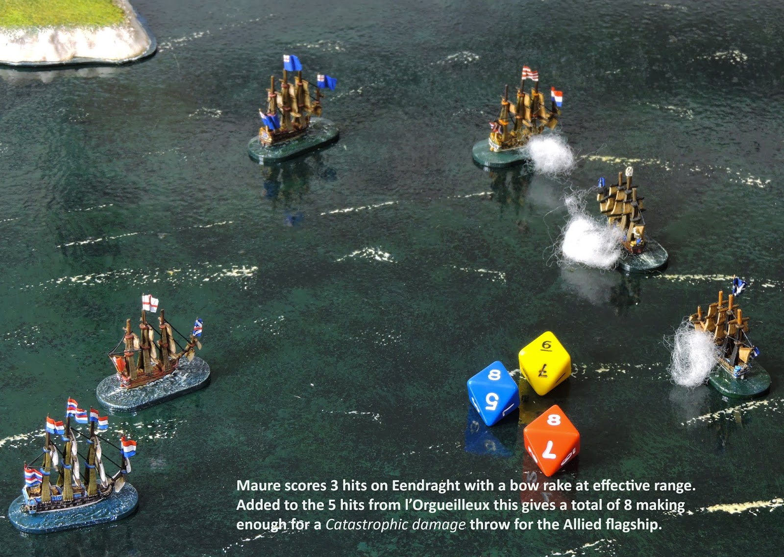 | Next up at Eendraght - Drilled 46 gun Maure - using d8s with 5 dice + d3(in this case 3) extra for the bow rake. |
