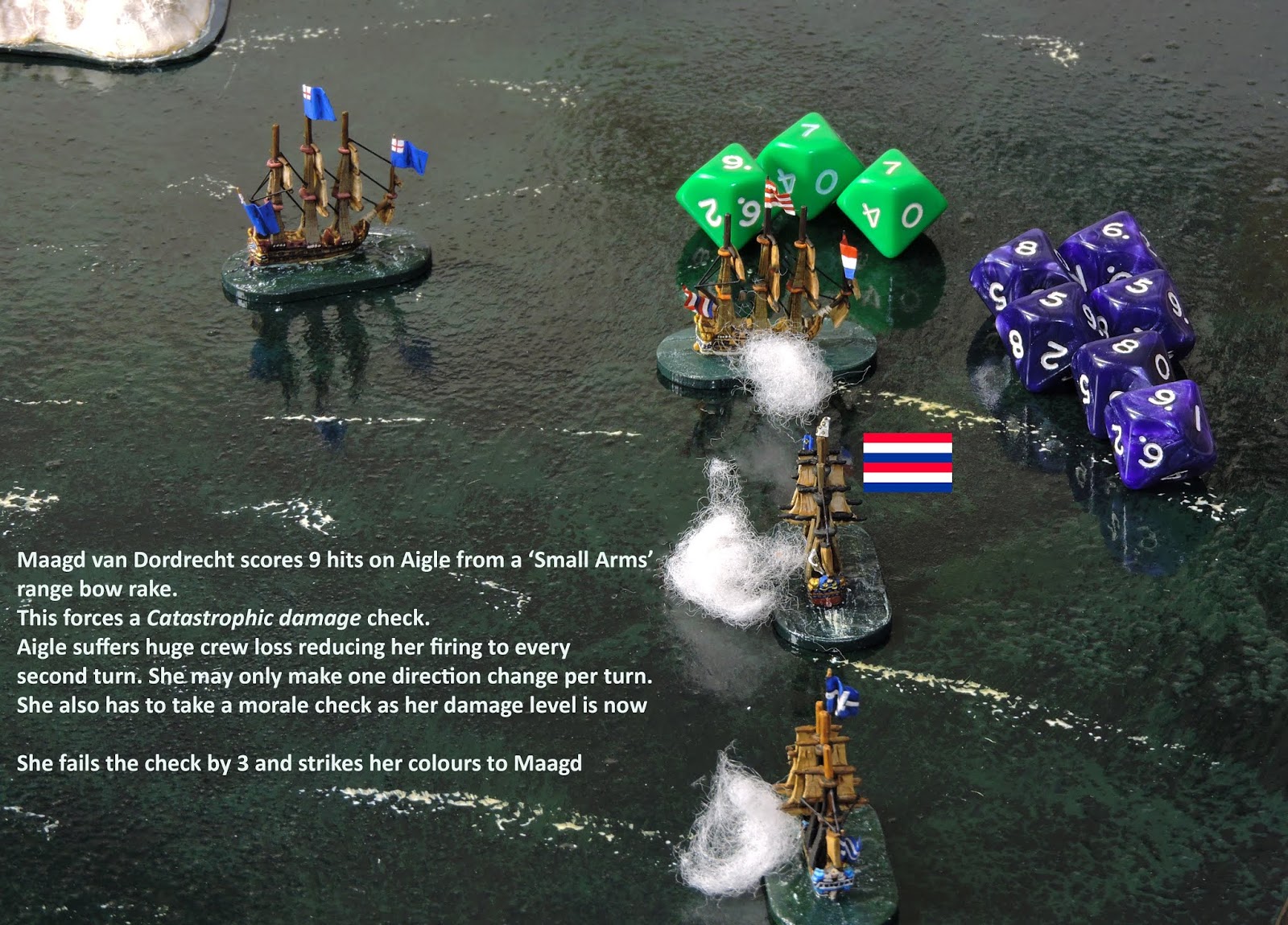 The huge amount of damage on Aigle (9 hits in a single turn) took her into the third level of ship degradation which is the first compulsory morale check condition. Alas, the Raw crew failed the necessary 5+ check on a d6 by 3 points despite receiving a +1 for a proximate friendly and intact vessel. She immediately struck her colours to Maagd which lowered a boat with boarding party and accepted her surrender. The Allies had their first prize!