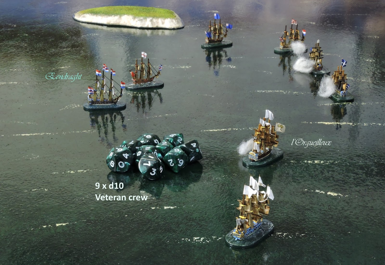 | The very first shot - The 86 gun l'Orgueilleux is Veteran and has basic allowance of 9 x d10 before range modification. |