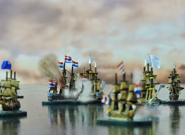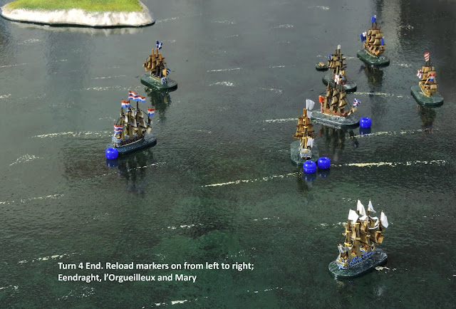 By the firing step in T4 the Allies had manouevred ships into two opportunities. The first involves Eendraght, which despite the nice paint job, beautiful flags and historical heritage, is proving to be an unlucky ship in 1/2400 scale at least. Taking on water with her lower gun deck already flooded, moving at half speed and with limited manouevre capability, she decides to expend her first broadside at extreme range lest she be unable to contribute later in the battle.