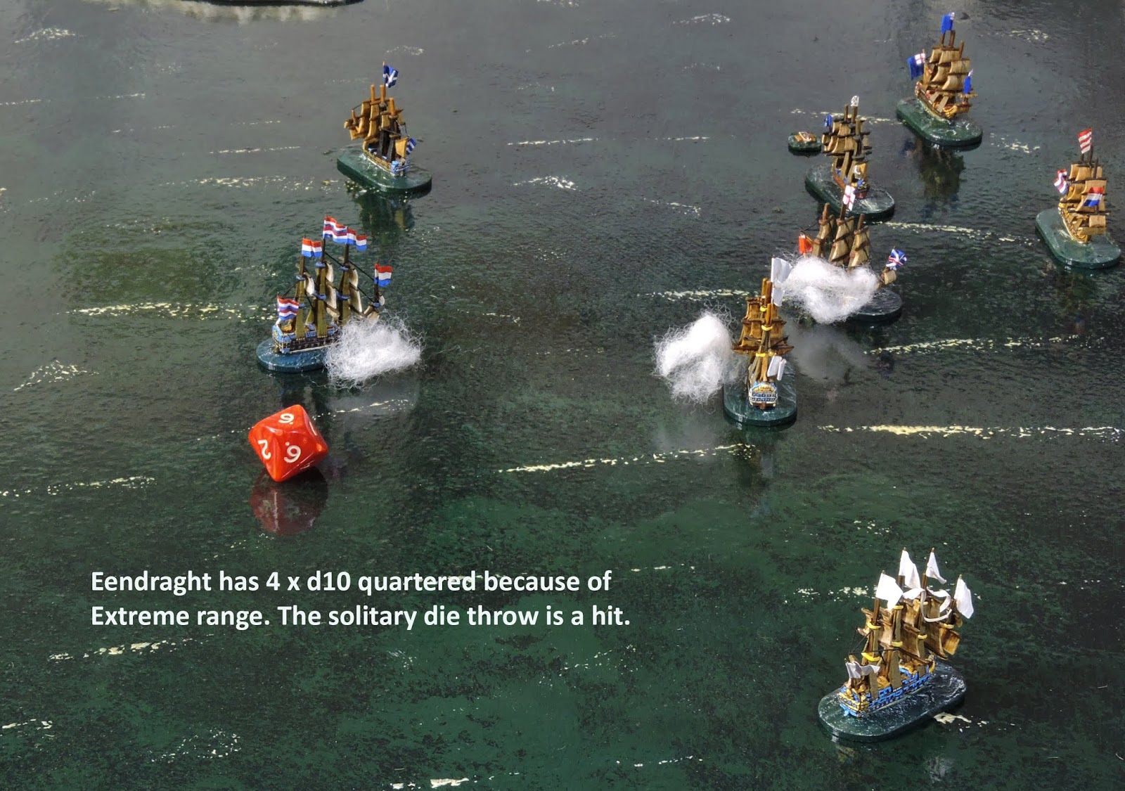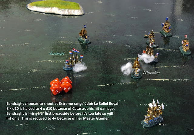The target is the enemy flagship. Eendraght has several advantages - a Veteran crew providing d10s, a Master gunner lowering the to hit score to 5 from 6 and the first broadside lowering the to hit score by a further one, to 4. The biggest problem is that her 80 guns, equating to 8 dice are halved because the lower gun deck is flooded. Extreme range quarters the four available dice to one. The mighty flagship looses her first broadside with a solitary d10 looking for 4 to hit. She achieves this with ease but it is not even a scratch on the enormous Le Soliel Royal.