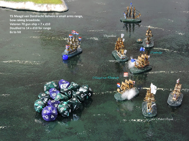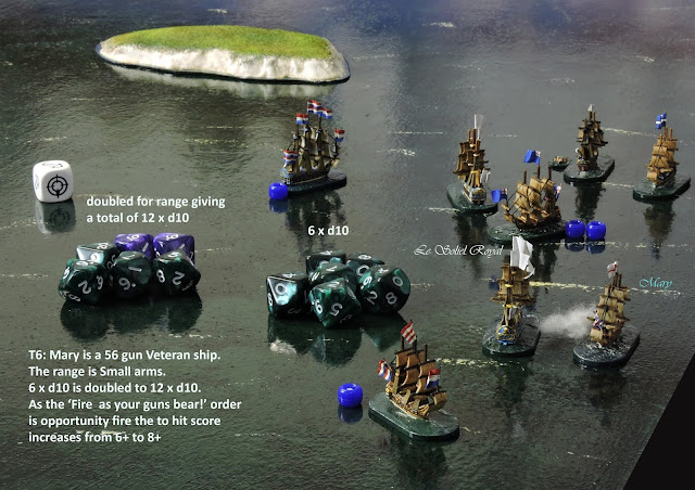 I have introduced what is effectively an opportunity fire rule called 'Fire as your guns bear!'. This can be invoked when a ship passes or is passed by a target which will obviously not be available at the end of all movement when the shooting step begins. A ship invoking the rule can freeze time and fire during it or, the enemy's move. Sounds gamey? well not really, the counterweight is that the shot is taken with all dice at -2 to hit so a 6 to hit becomes an 8 to hit. Clearly impossible for a Raw ship using d6 and very difficult for a Drilled ship using d8s. For a Veteran ship using d10, it becomes more of a proposition. The Mary is such a ship. A Veteran 56 gun 4th rate, gliding by the enemy flagship at less than 100 yards with her broadside loaded and ready to fire! That is just what she did!