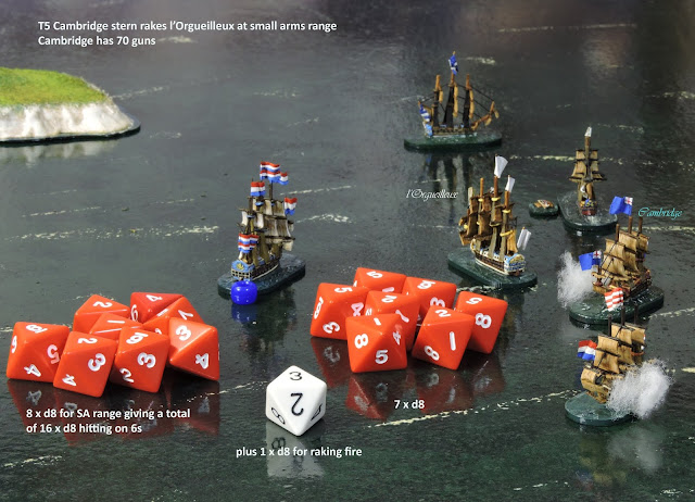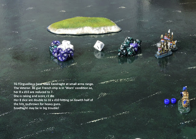 The next drama is somewhat different. The limping, sinking Eendraght was unable to avoid even a slow lumbering, heavy-gunned monster like l'Orgueilleux. The French ship at around 50 yards hove across Eendraght's bow and raked her with 16 x d10. L'Orgueilleux's firing capability has already been degraded but this position and range plus her heavy armament offer the money shot so far in the battle.