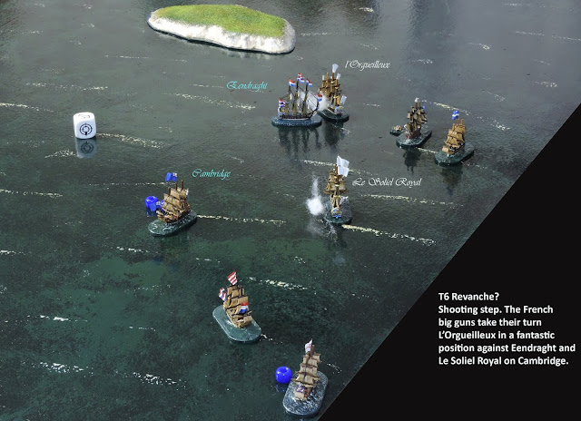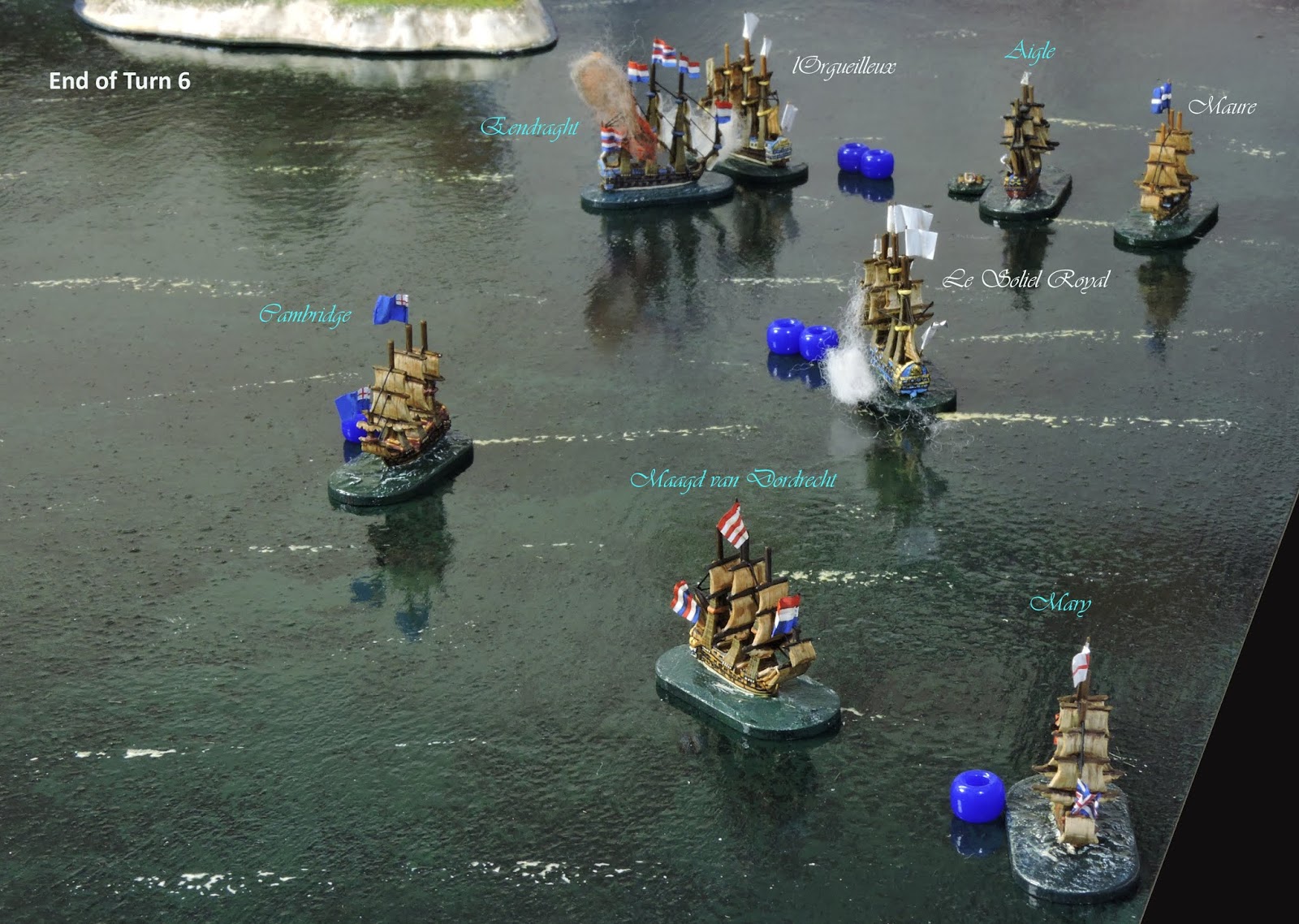 At the shooting step of T6 the tables have turned. Mary has sailed on, the rest of the Allied squadron is out of position and now the big beasts from France may gain revanche!