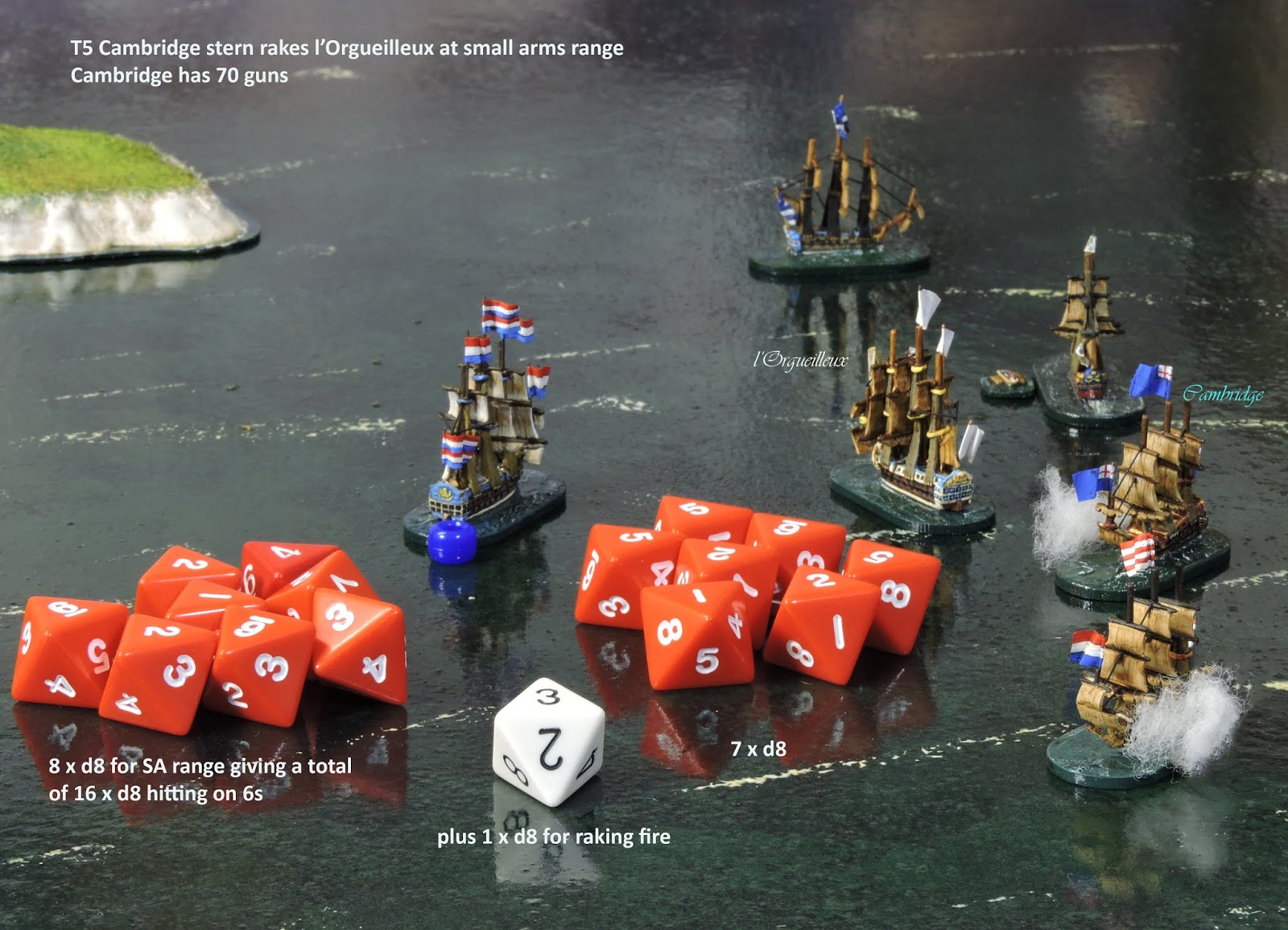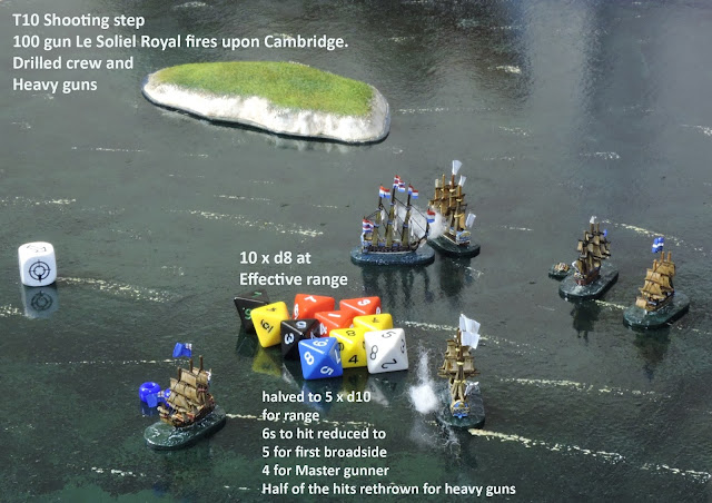 Le Soliel Royal (100) begins with 10 x d8 as her crew is Drilled. These ten dice are halved for range but her to hit score goes down to 4 because it is a first broadside and she has a Master Gunner aboard. In addition, half of the misses are re-thrown due to her carrying heavy guns. It is a respectable score on Cambridge but alas not enough to compel the Catastrophic damage check even on a 3rd rate.