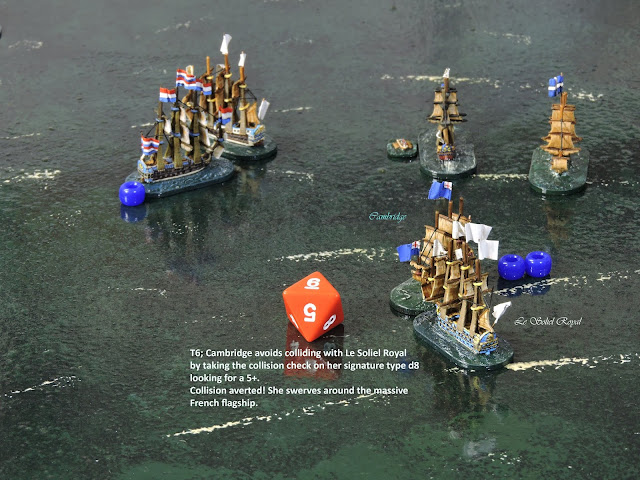 Refreshingly, the French were clear winners in the initiative stakes of T6 . Cambridge was in danger of colliding with the massive and yet unscathed Le Royal Soliel and was compelled to take a collision check for moving within one inch of the enemy ship. 5+ on a signature die throw was required to avoid even a glancing blow on the giant which she actually achieved! Cambridge swept across the bows of the slow moving Frenchman and passed undamaged, for now.