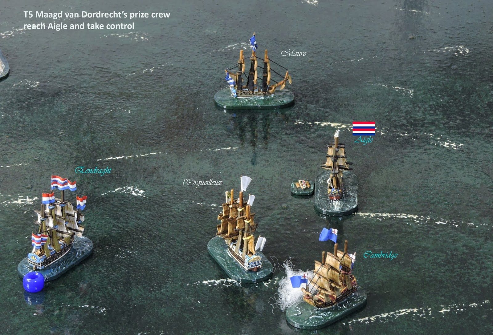 Once again in T5 the Allies won initiative. Only Allied ships were in a position to fire during the turn and the narrative deals with those opportunities further on. In the shot above, a vignette of 17th century naval warfare. Aigle has struck her colours and a prize crew longboat from Maagd van Dordrecht has just come alongside to take possession. In the foreground the fighting continues with the Cambridge (70) stern raking l'Orgueilleux.