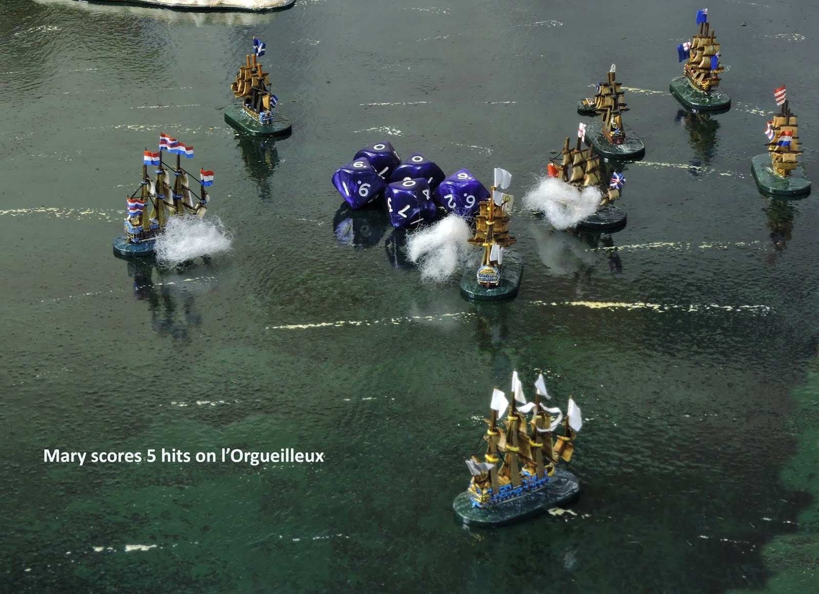 The next ship to fire is the Veteran 56 gun Mary. She has sailed across the bows of l'Orgueilleux at small arms range she adds a further 1 x d10 to her 6 x d10 for a bow rake and doubles the total to 14 x d10. Mary scores a disappointing five hits. This is a significant number but not enough to cause a Catastrophic damage check.
