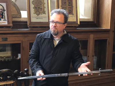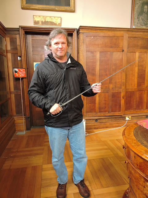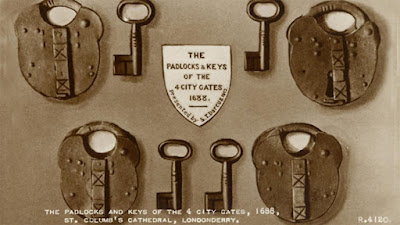 At the top, Barry holds the sword of Rev. George Walker and below I have Captain Adam Murray's (more on that later). There was also George Walker's Bible, Captain Murray's pocket watch, snuff box, and a brace of buttons from his coat, cannon balls, more swords, old maps - again, I got so enthralled I didn't snap more pics. We also got to hold the actual locks and keys used to secure the gates against the Jacobite attack - something even King James didn't get to do (pic below is from the web... I think Barry got a shot of the actual objects)!