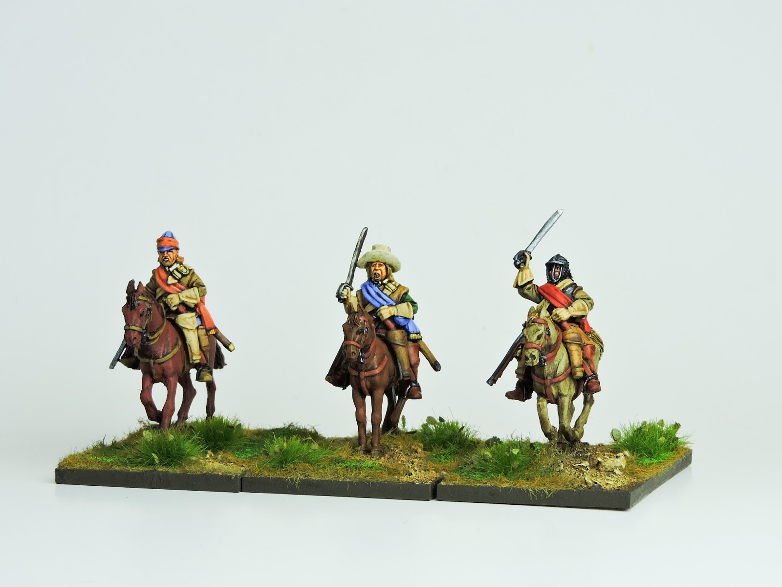 This first article shows three of the models which I have managed to squeeze into my painting schedule between lots of GNW and WSS pieces. I have tried to show different colours -tawny, crimson and blue sashes and different shades on the buff coats.