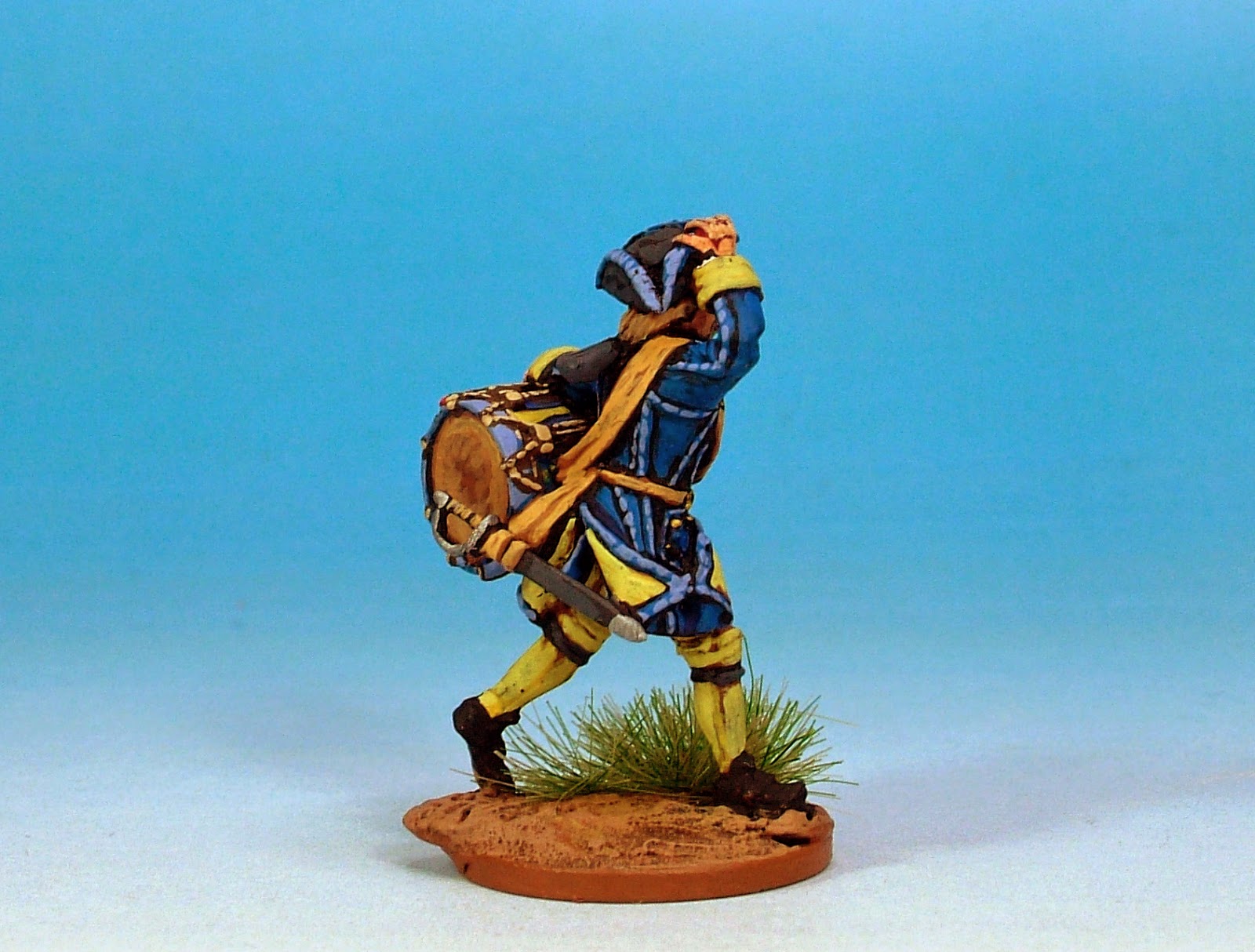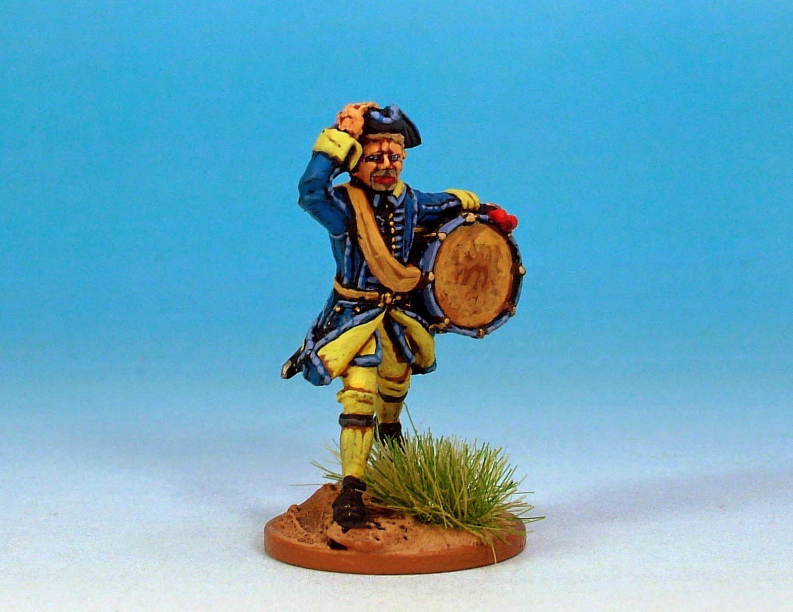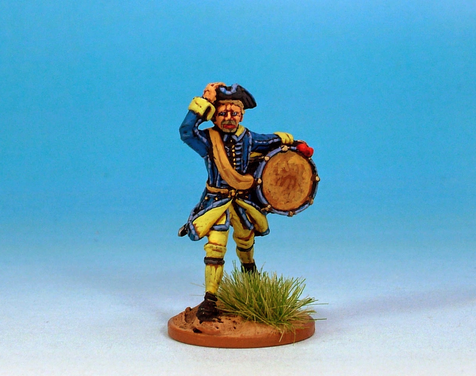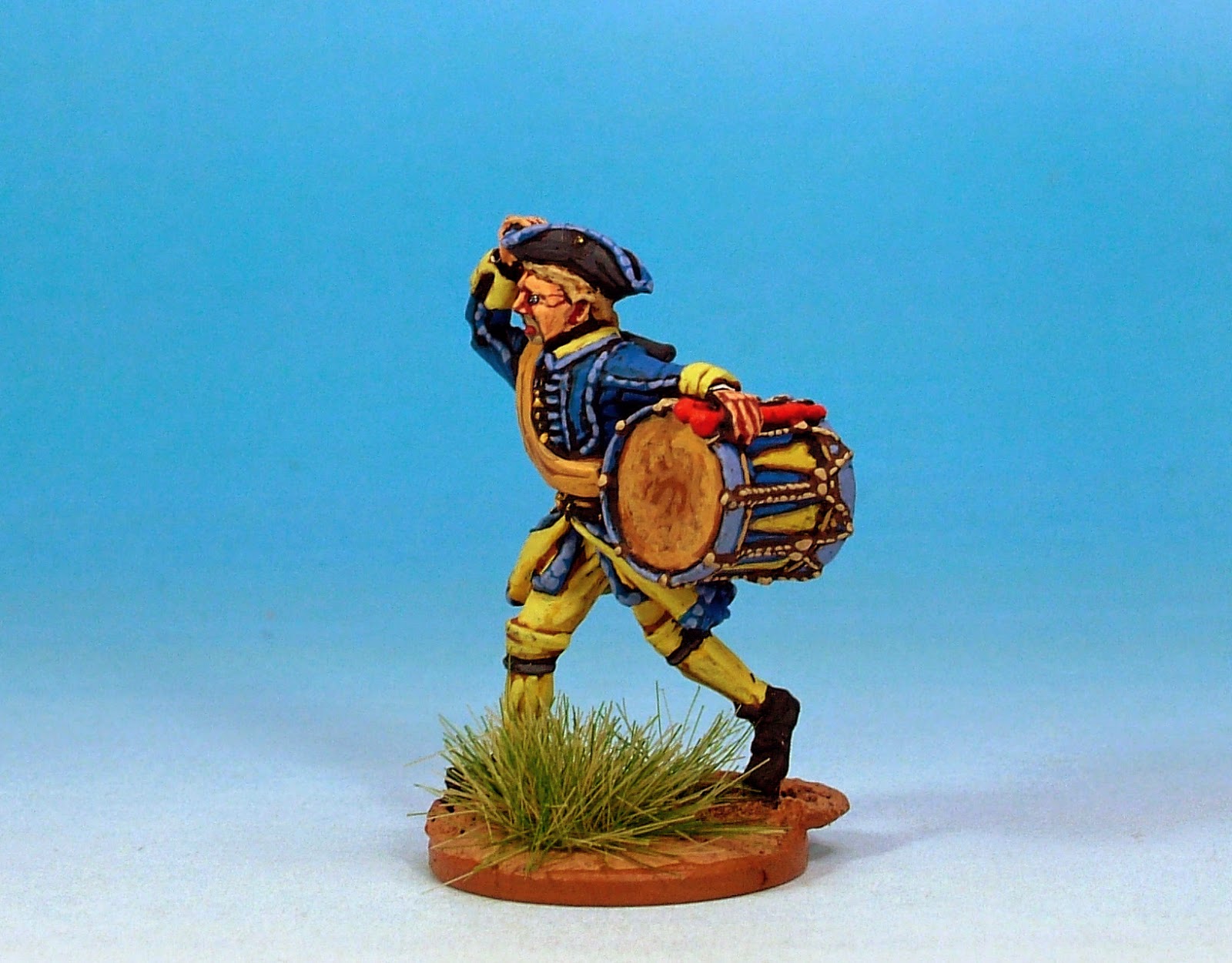 The Drummer is a gem. Carrying his huge drum and trying desperately to hang on to his hat he is running to keep pace with his charging battalion. His coat is decorated with lace and his drumsticks are grasped in his left hand.