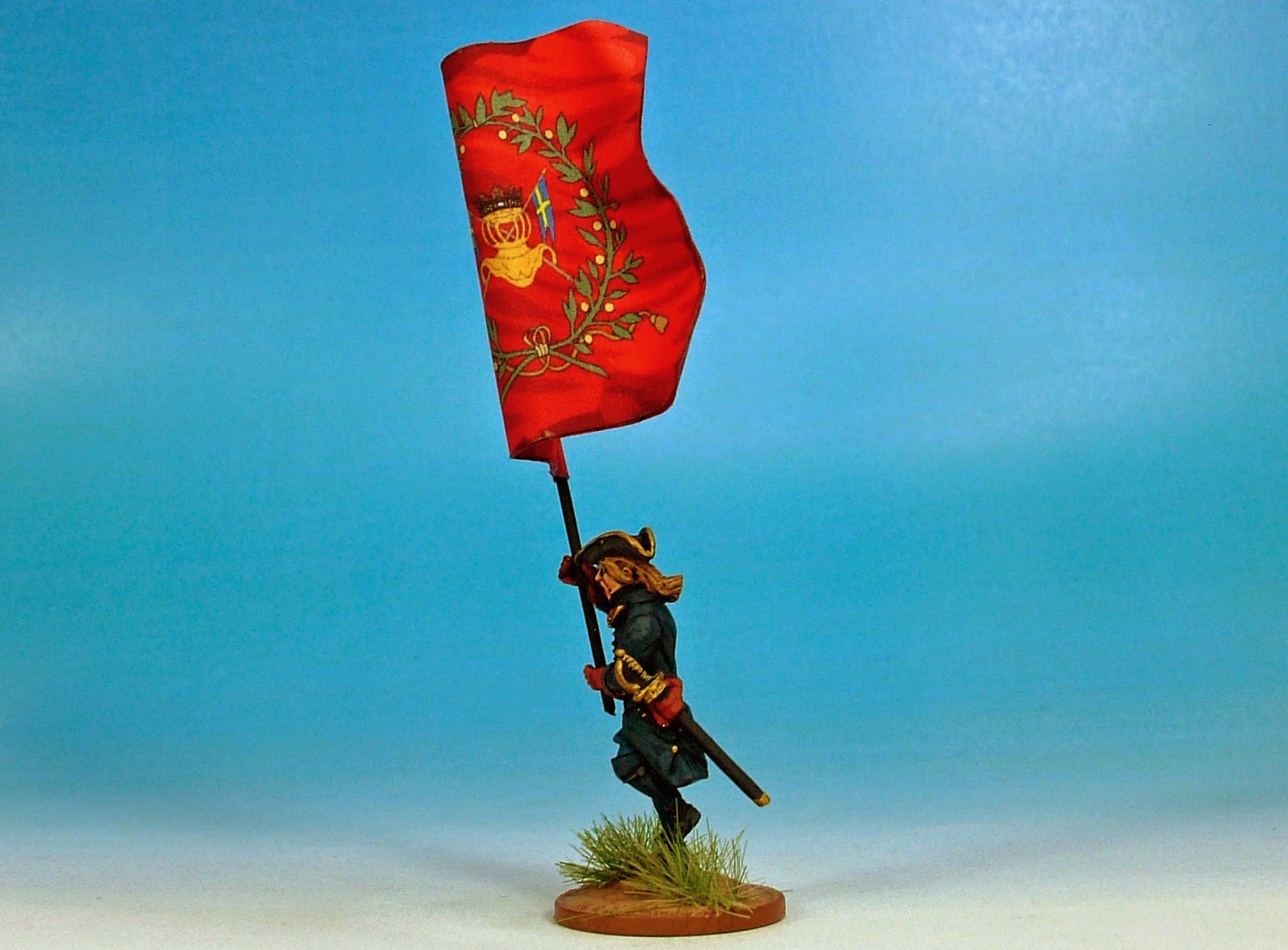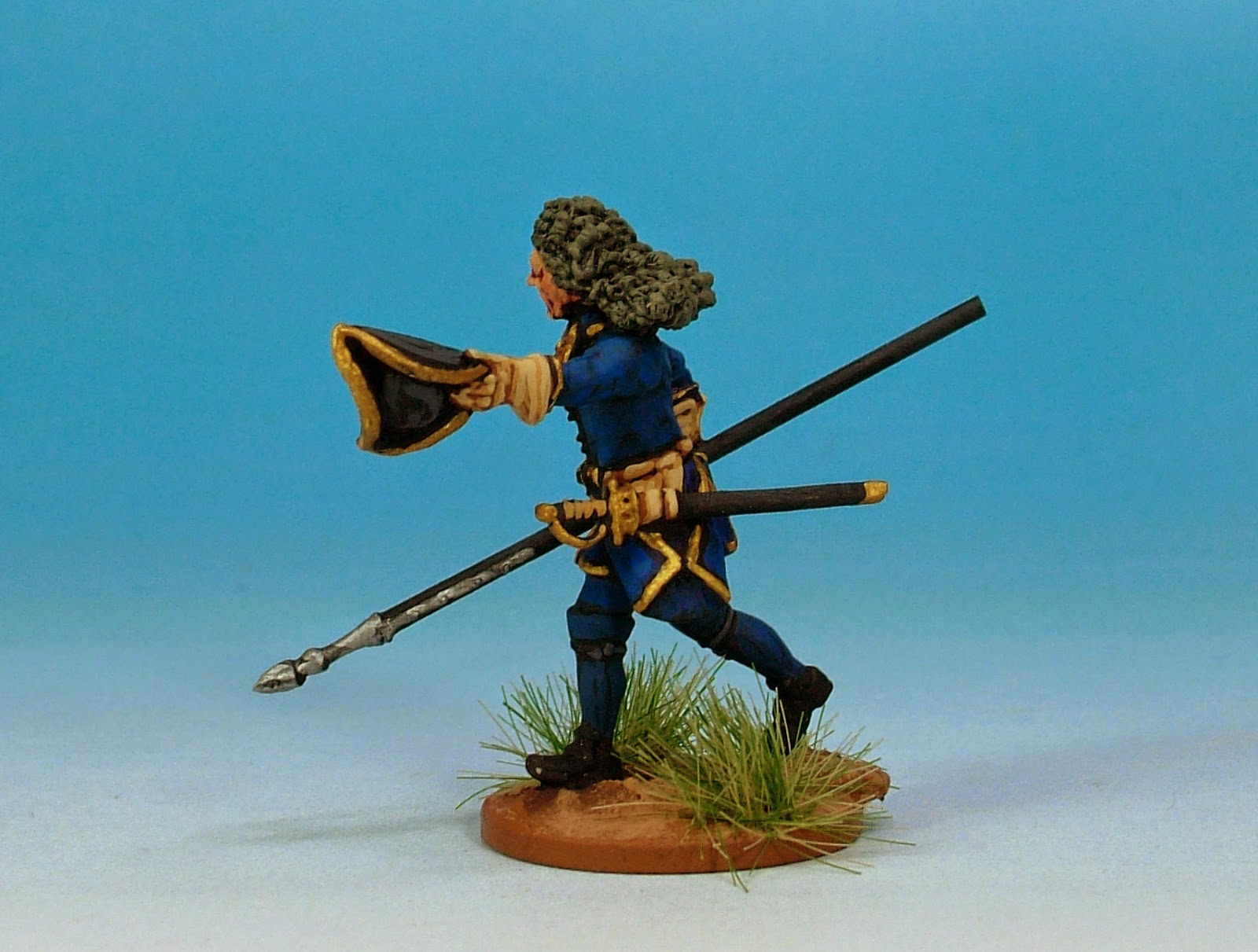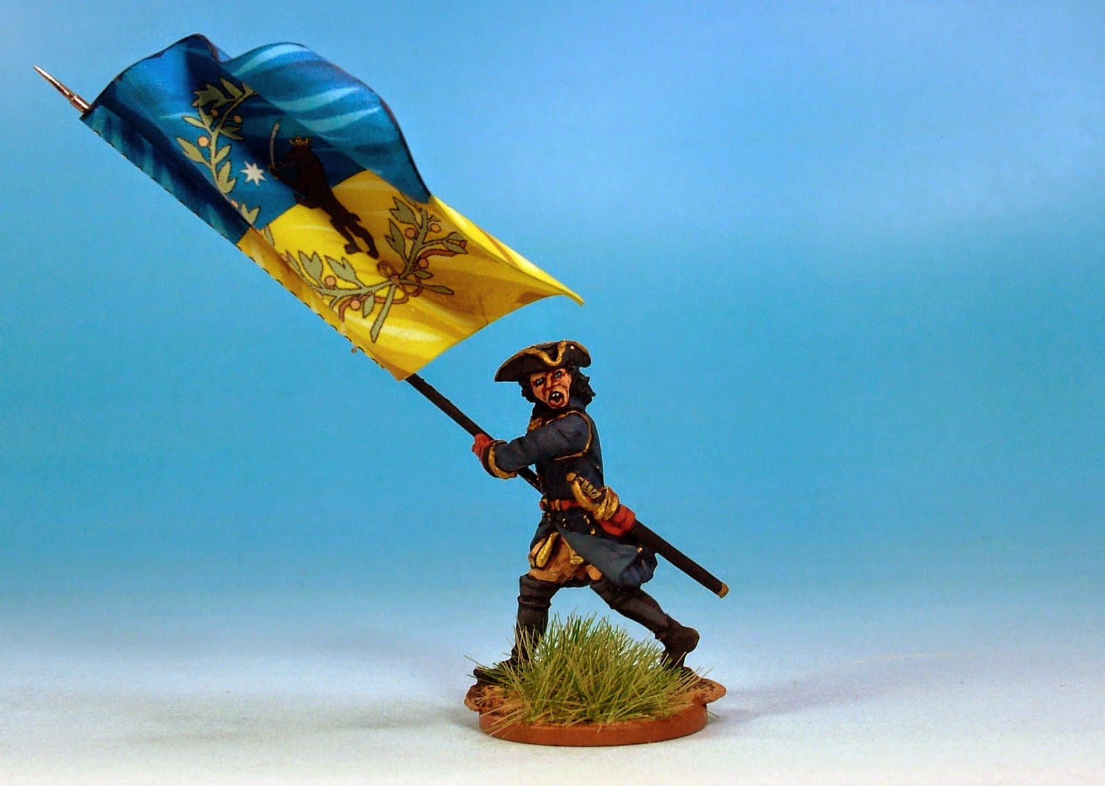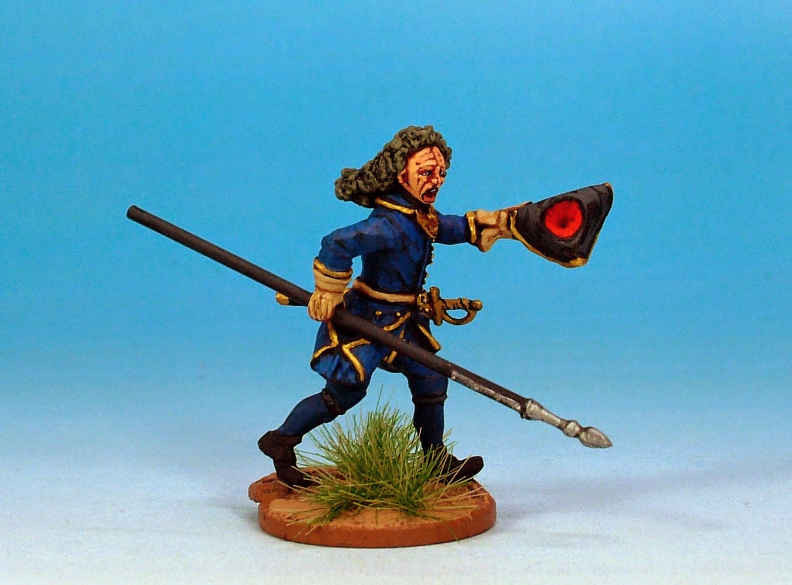 The Ensign appears older and more experienced. He strides out, colonel's colour held aloft and shouting for both God and King Karl.
