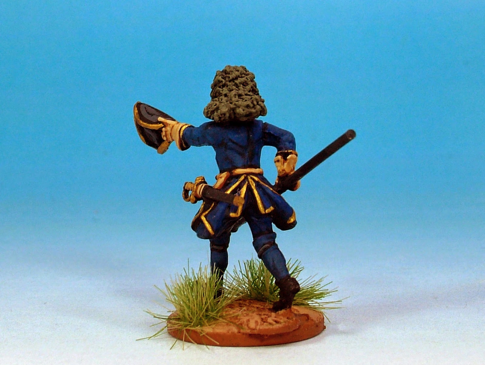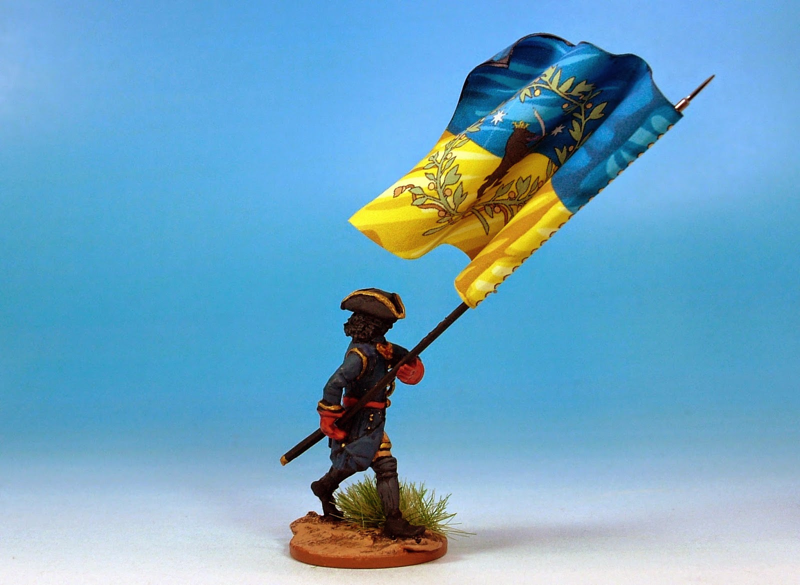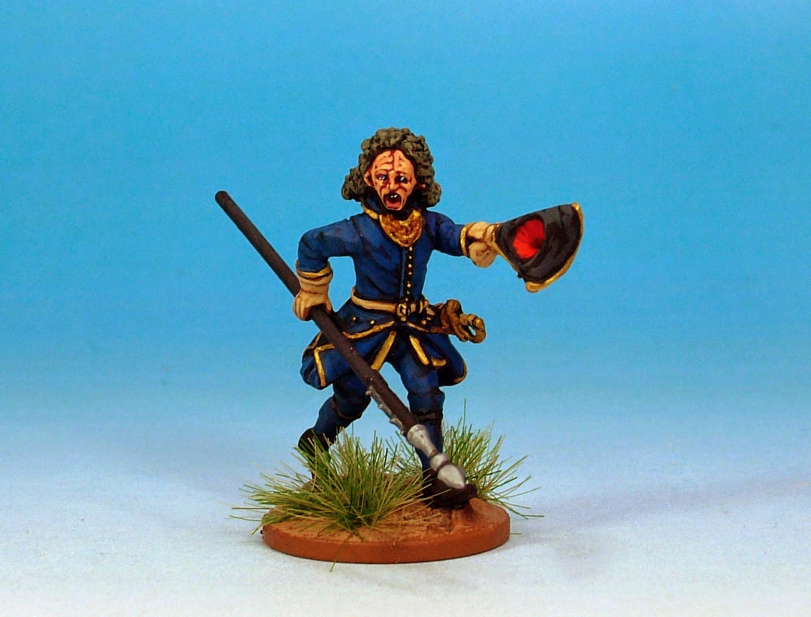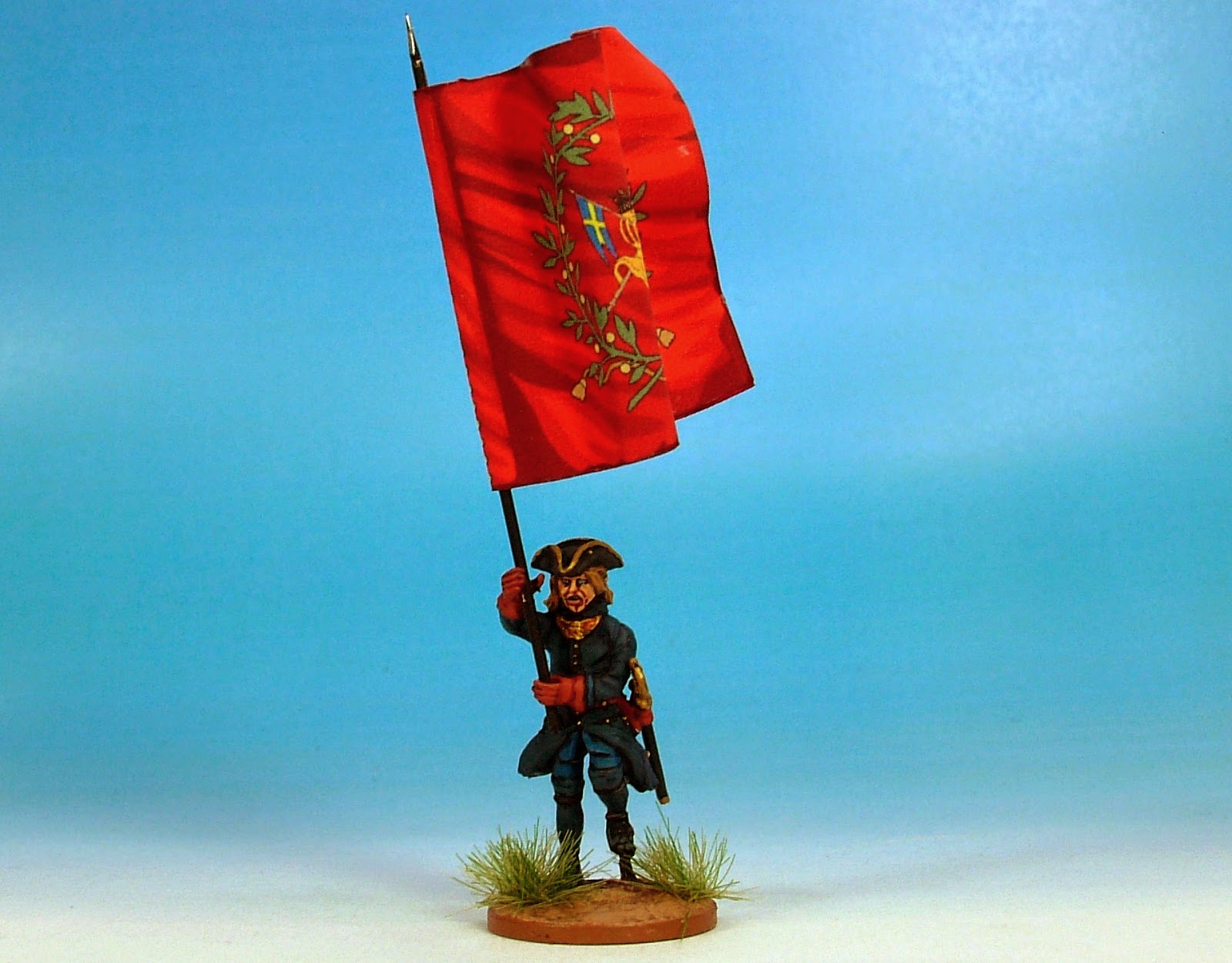 The Ensign appears older and more experienced. He strides out, colonel's colour held aloft and shouting for both God and King Karl.