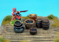 - 2 barrels, metal cauldron, powder basket, water half butt, upturned church bell used as mortar for powder grinding and sieve.