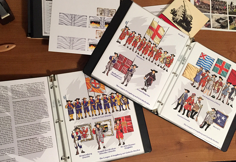 I printed the uniform plates on glossy photo paper and the text pages on quality bond paper. They are inserted into 3-hole punched plastic sleeves and placed in a binder. Now, I'm fussy about such things and it bugged me that the sleeves with only bond paper felt flimsy next to any with a sheet of photo paper. To 'fix' this I placed blank sheets of card stock in those to bulk them up. Yes, well, it made me feel better...
