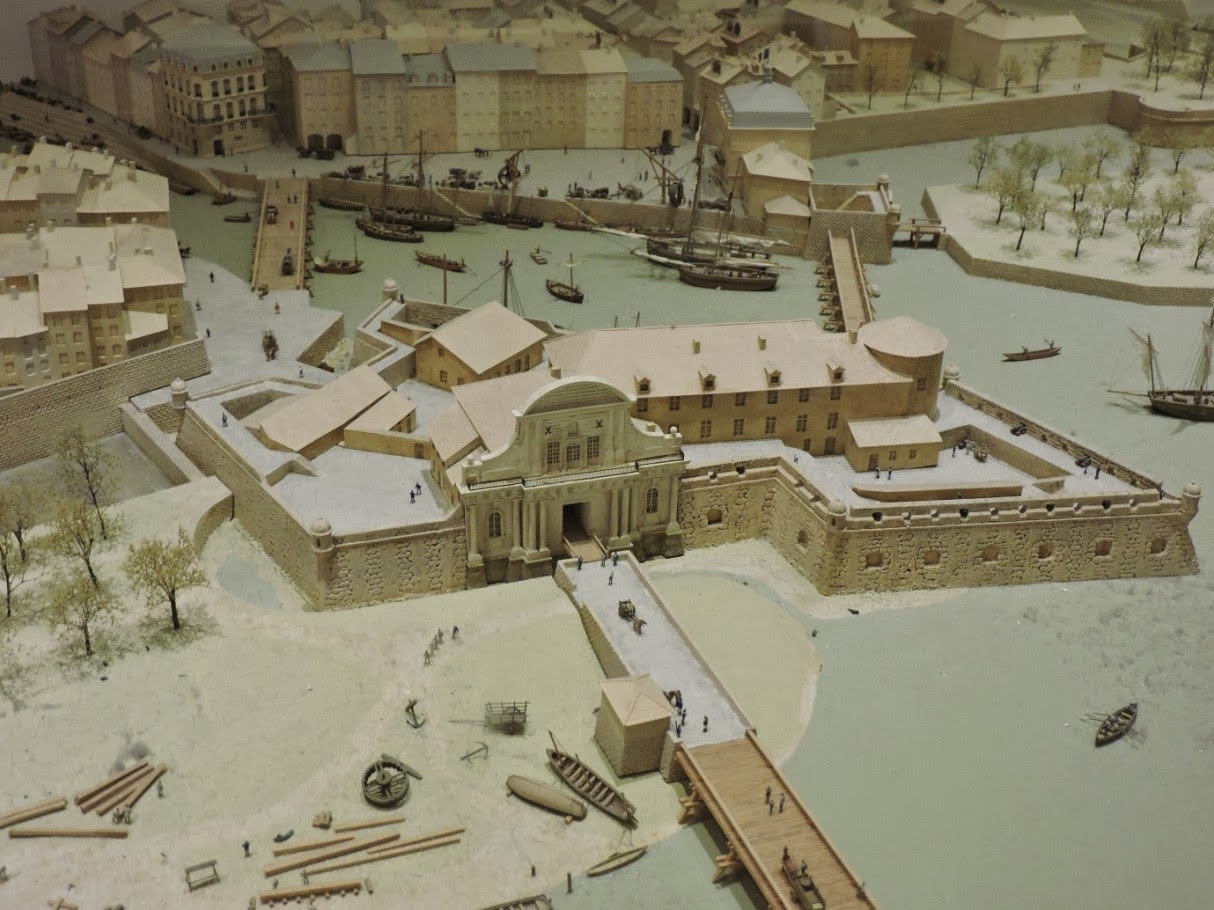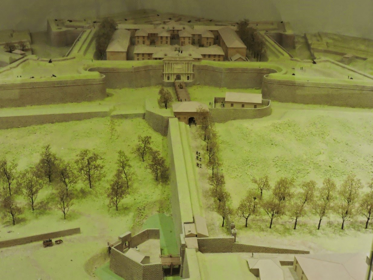 The model illustrates how the town looked in the 18th century. Trees line the esplanades and the houses cram together behind the massive walls and ramparts.
