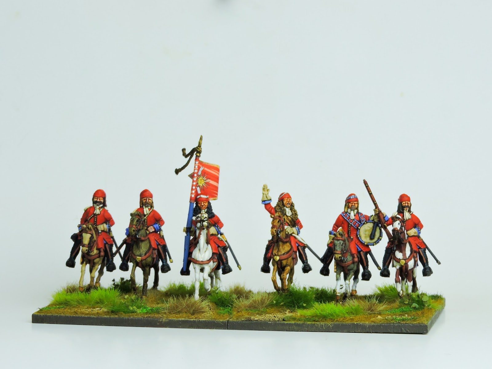 These are painted as Dragon La Reine (The Queen's Dragoons). The distinctive French uniforms and large number of regiments in Louis XIV's army make them a very colourful and useful component.
